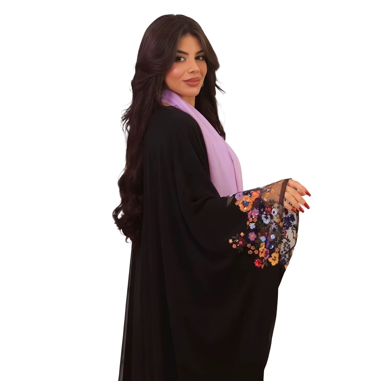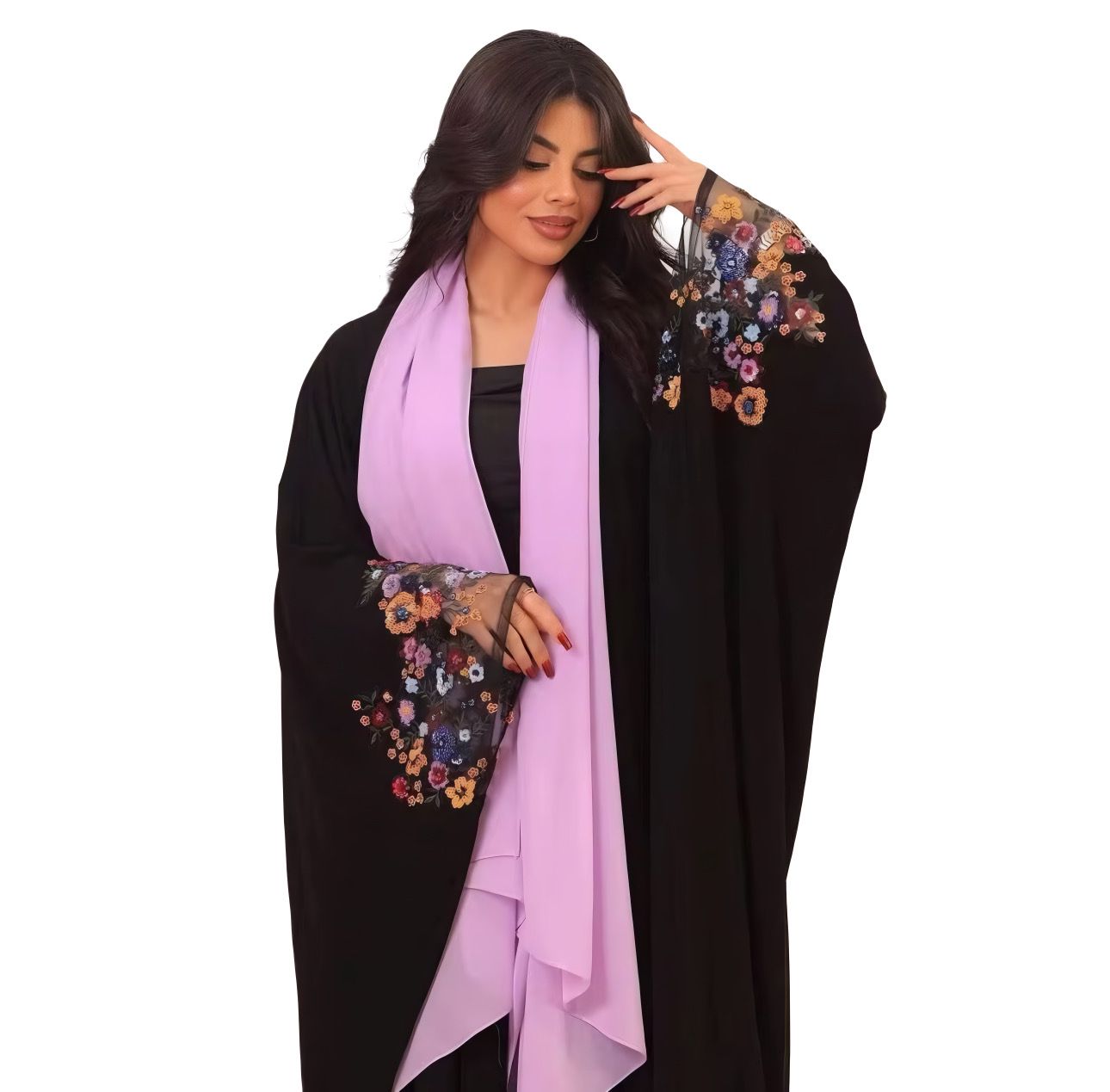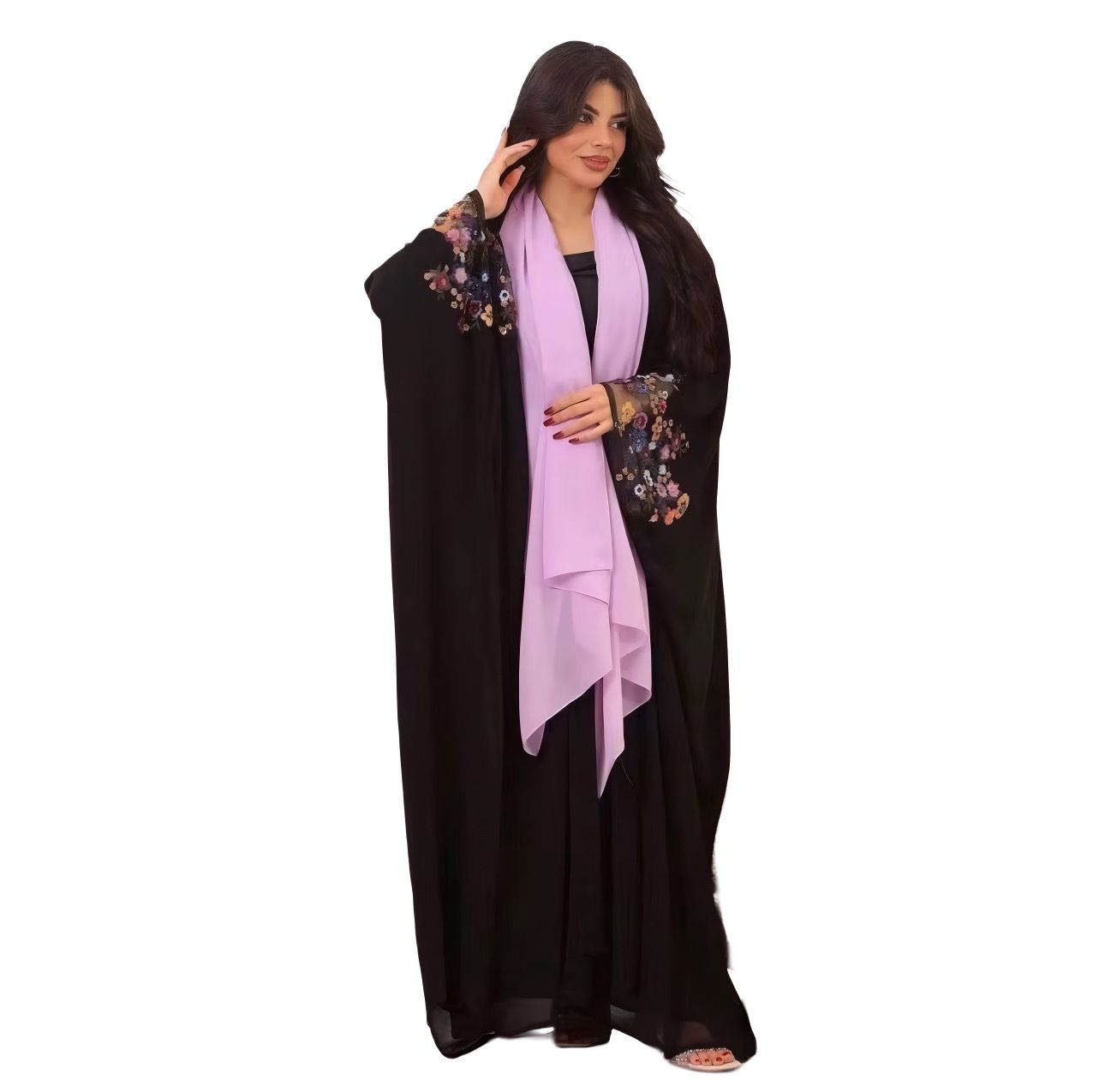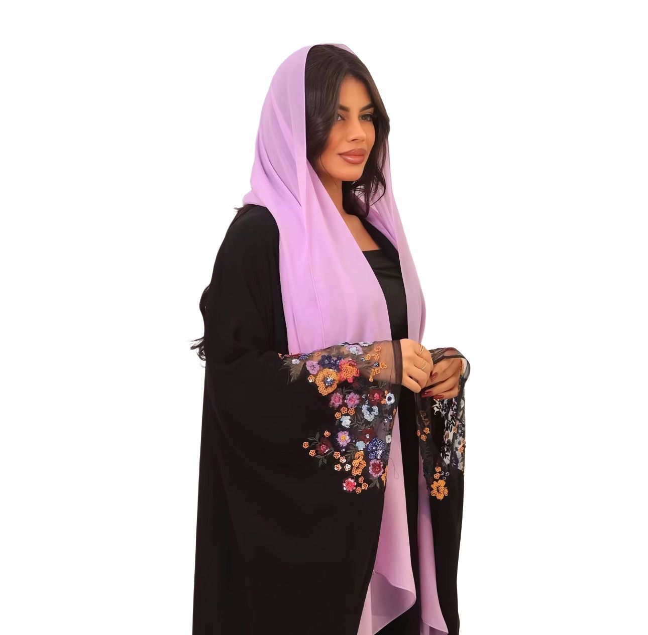 Inspired by the vibrant color of autumn and spring, the Secret Garden Marrakesh Set features a black abaya with delicate, life-like floral embroidery along the sleeves. The slightly lifted sleeves, crafted from lightweight fabric, bring natural movement and elegance to every bloom. A soft lilac hijab completes the ensemble, wearable as a scarf or styled in the hair, offering versatile femininity and grace. Perfect for formal events, celebrations, or sophisticated everyday wear.