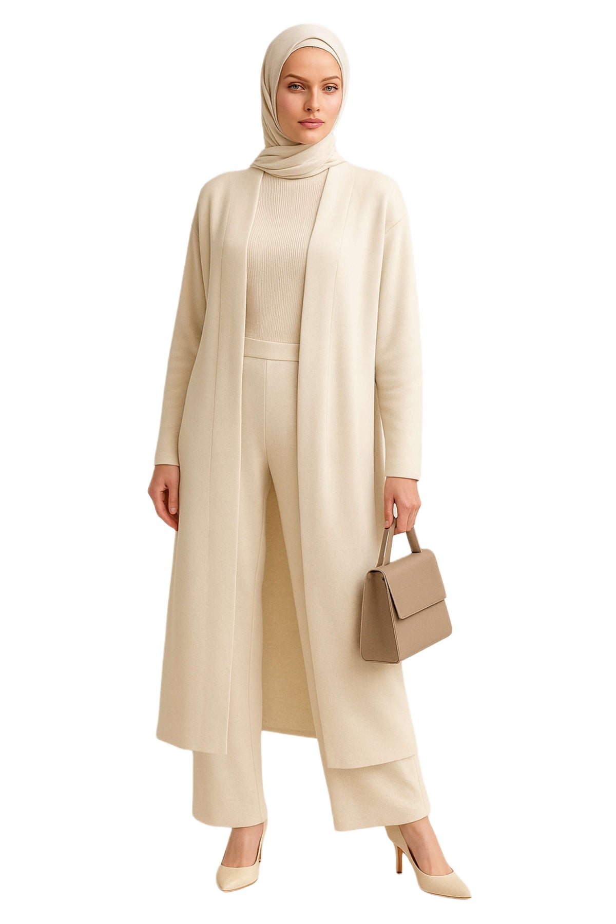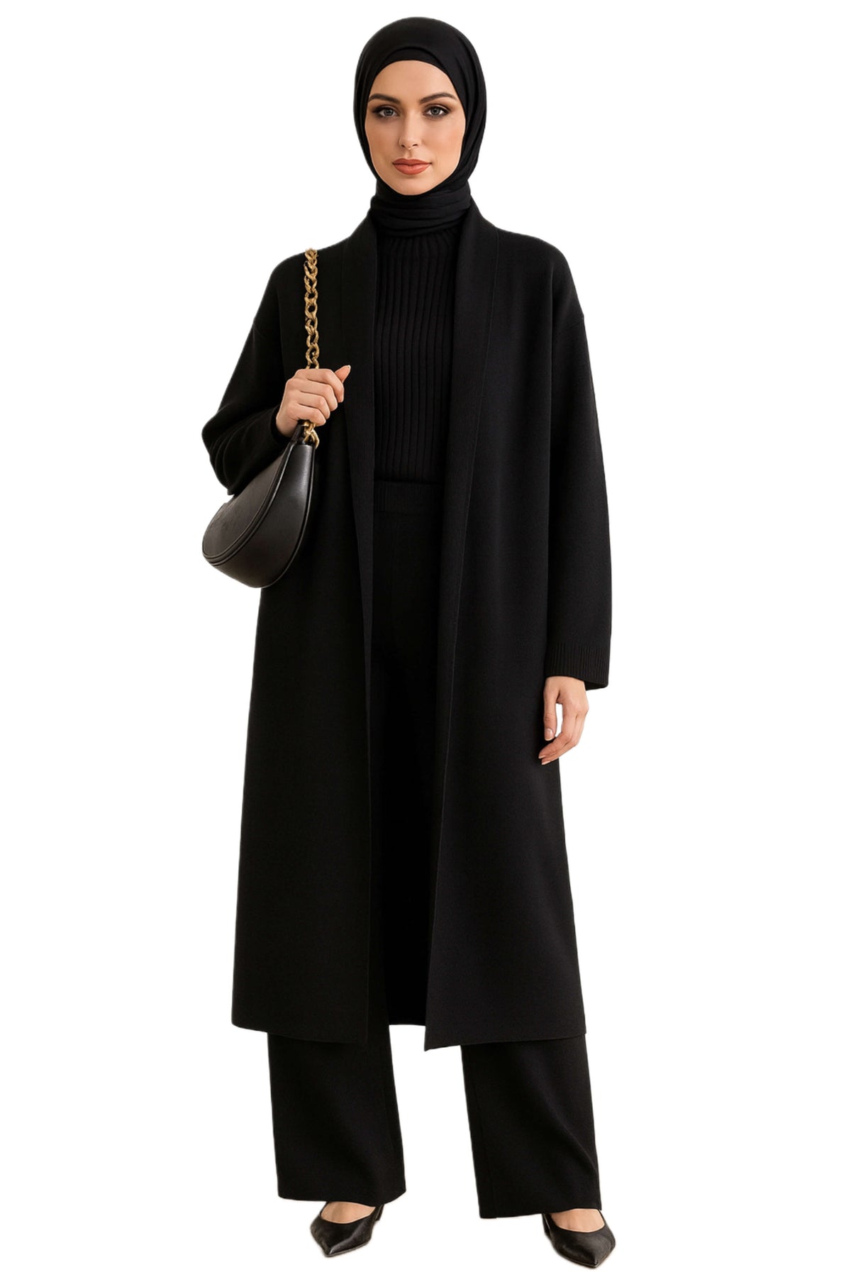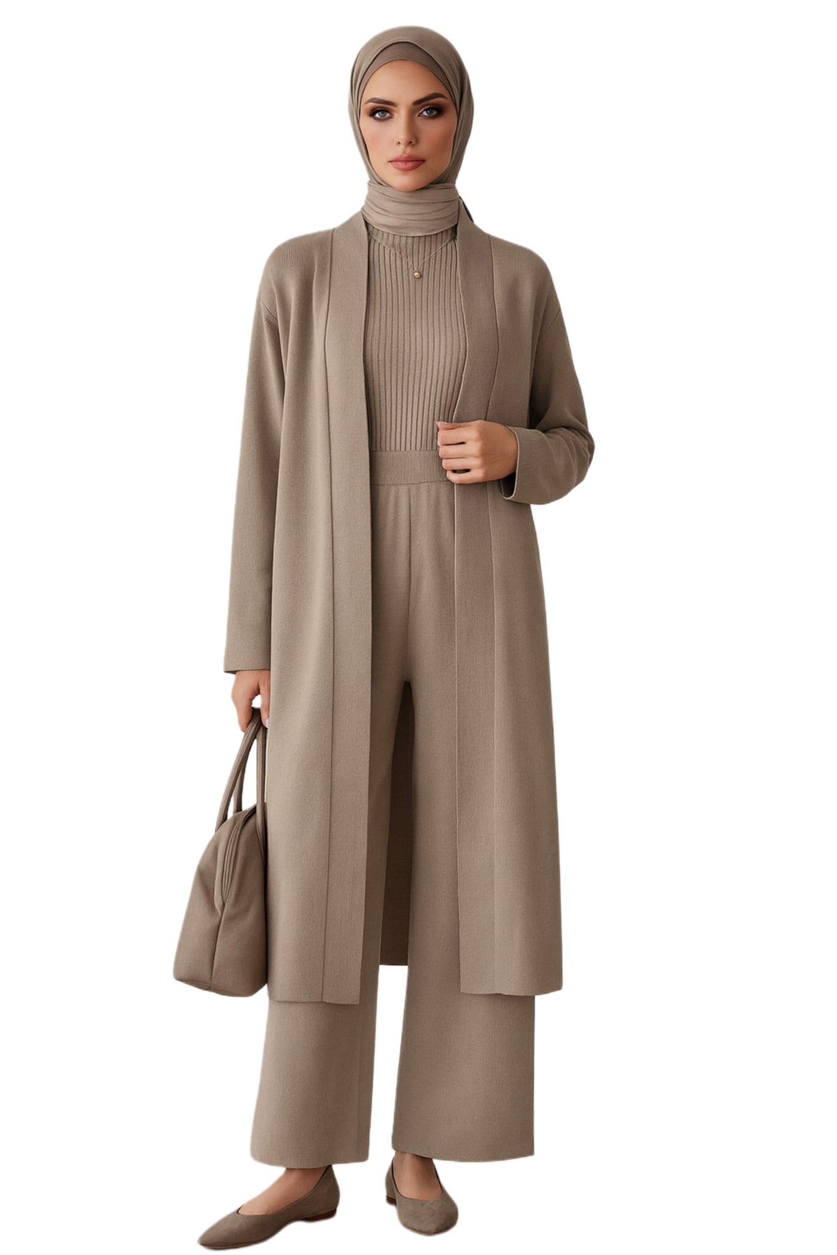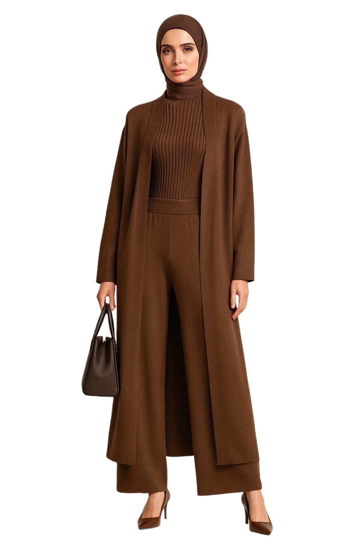 Three-piece knit set: ribbed turtleneck, wide-leg pants, and flowy cardigan. Lightweight, soft stretch, relaxed fit. Perfect from workdays to casual evenings.