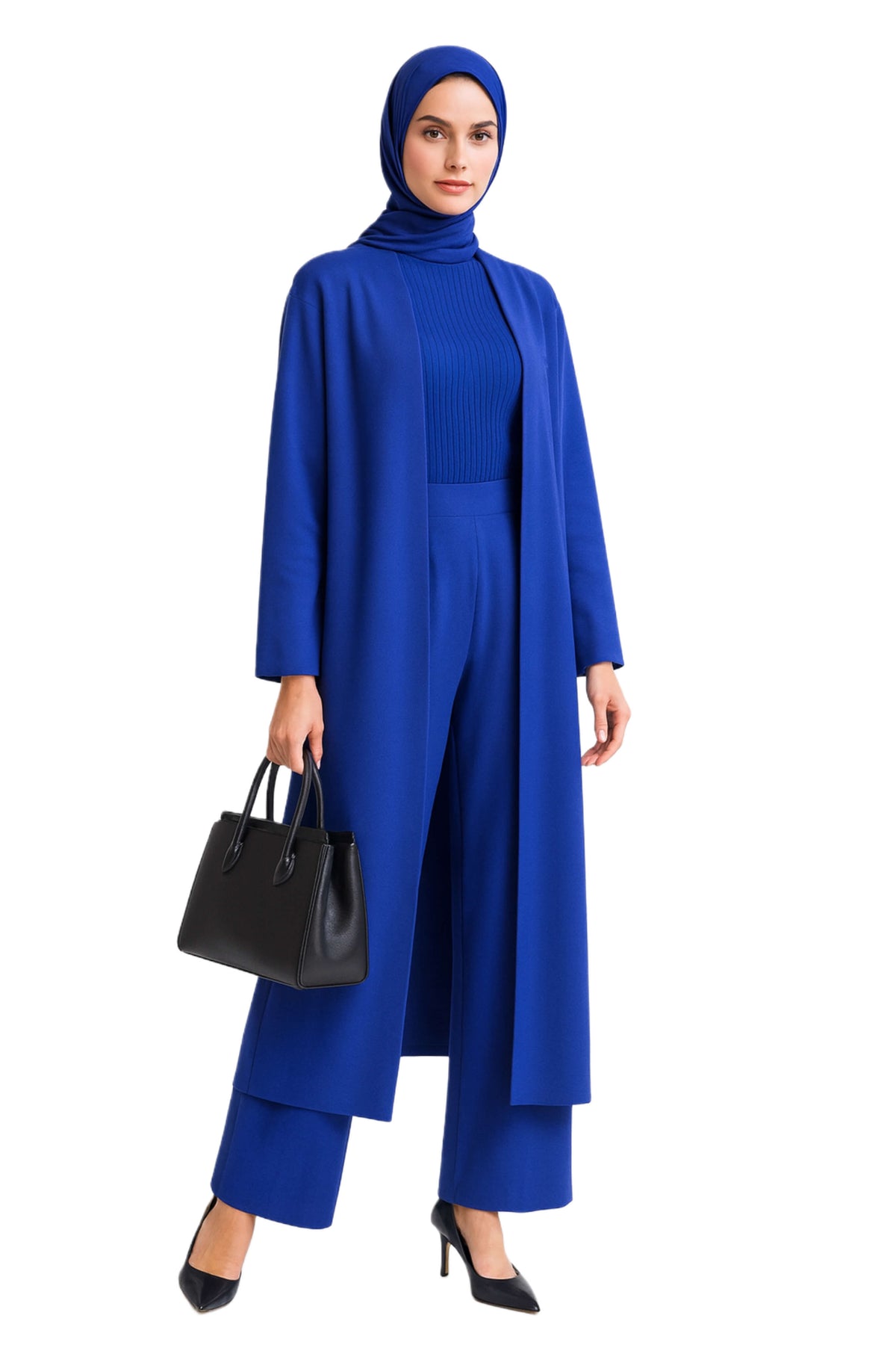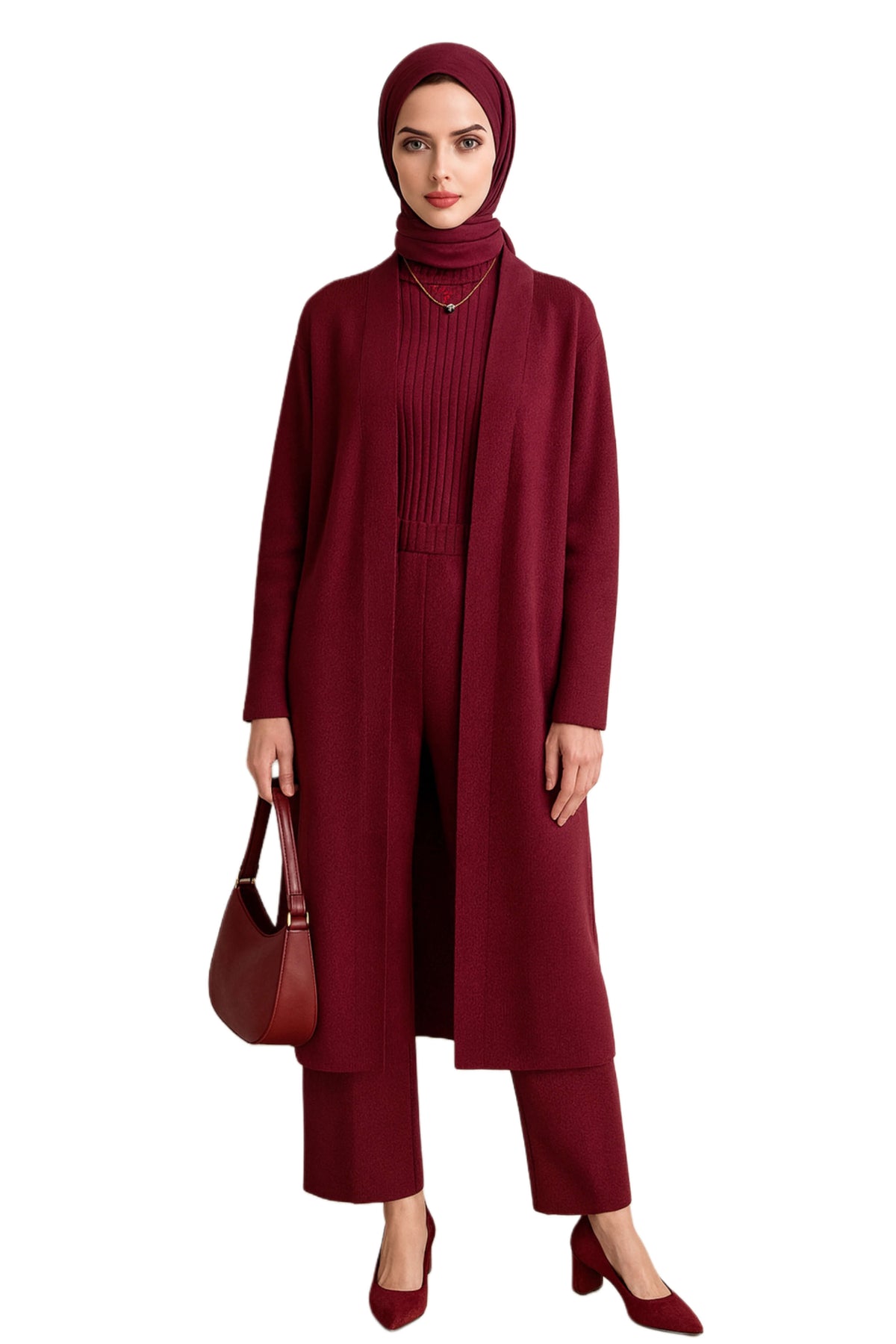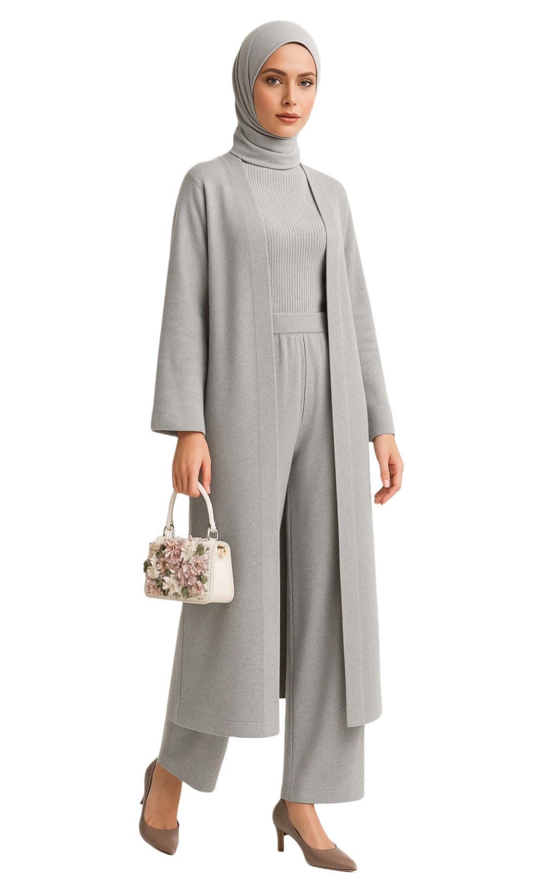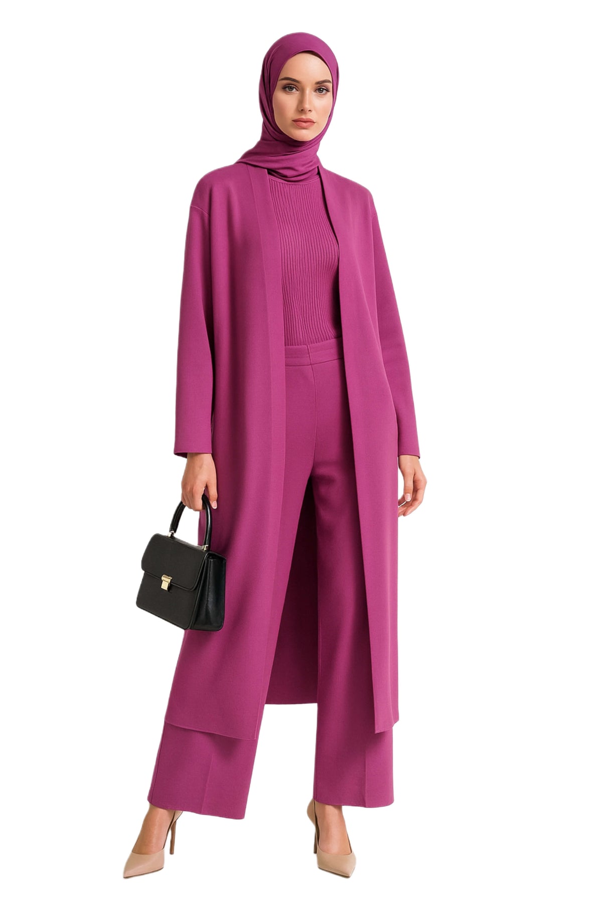 Three-piece knit set: ribbed turtleneck, wide-leg pants, and flowy cardigan. Lightweight, soft stretch, relaxed fit. Perfect from workdays to casual evenings.