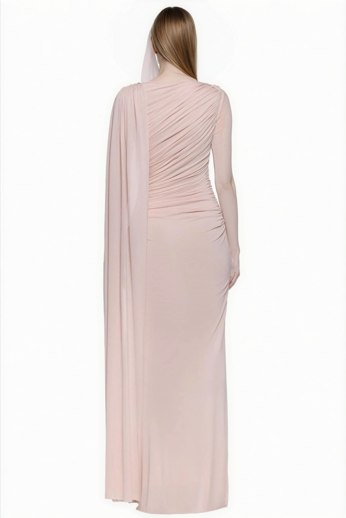The Alnitak Veil Draped Gown Long Sleeves is crafted in a soft rosé couture jersey that shapes the body with natural elasticity and refined sculptural draping. The asymmetric veil panel falls from the shoulder in a pure, uninterrupted line, creating movement and an elongated celestial silhouette. Long fitted sleeves extend the clean, minimal architecture of the gown, while soft side gathers frame the waist and transition into a smooth, straight skirt that enhances the gown’s ethereal softness.