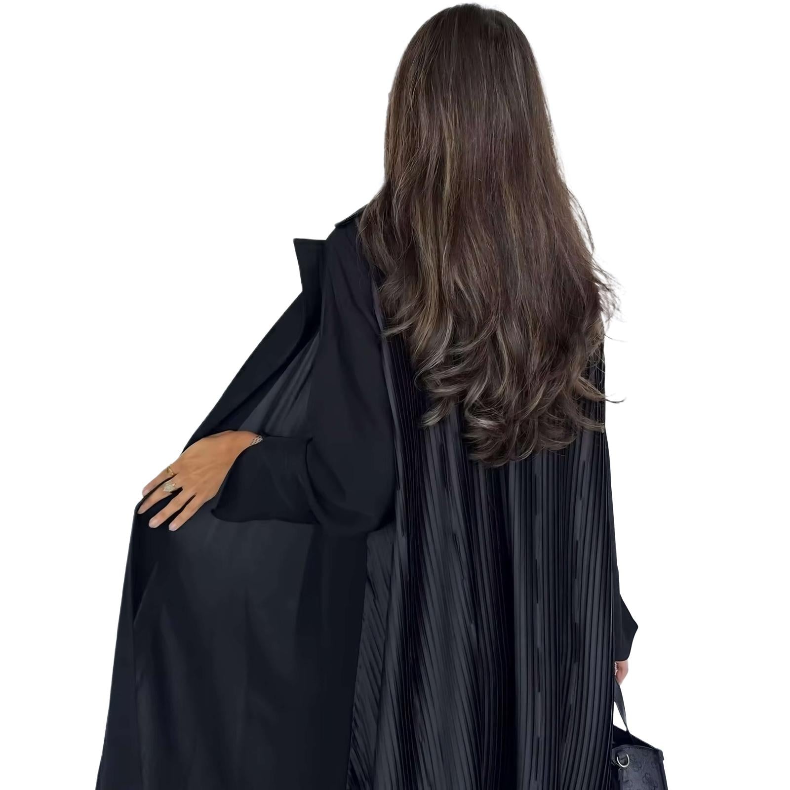 A timeless icon with a modern twist. The Classic Black Abaya features a flowing cut that refines the silhouette, creating an effortlessly elegant drape. At the back, premium satin with discreet geometric detailing adds depth and sophistication, perceptible yet subtle, bringing richness and glamour without losing its modest essence. Finished with gathered sleeves and couture-inspired stitching, this abaya transitions seamlessly from day to night.