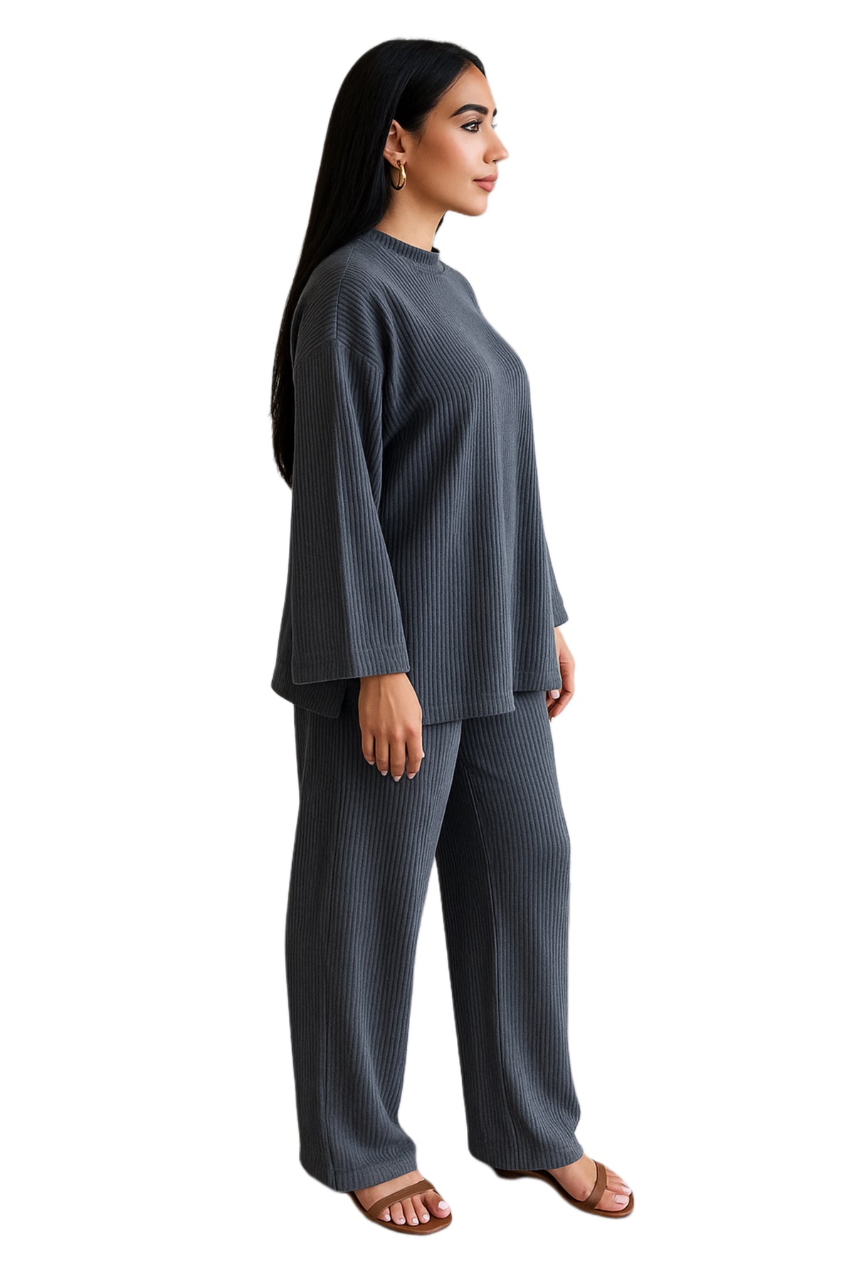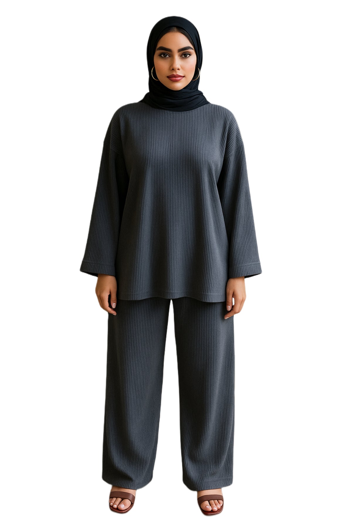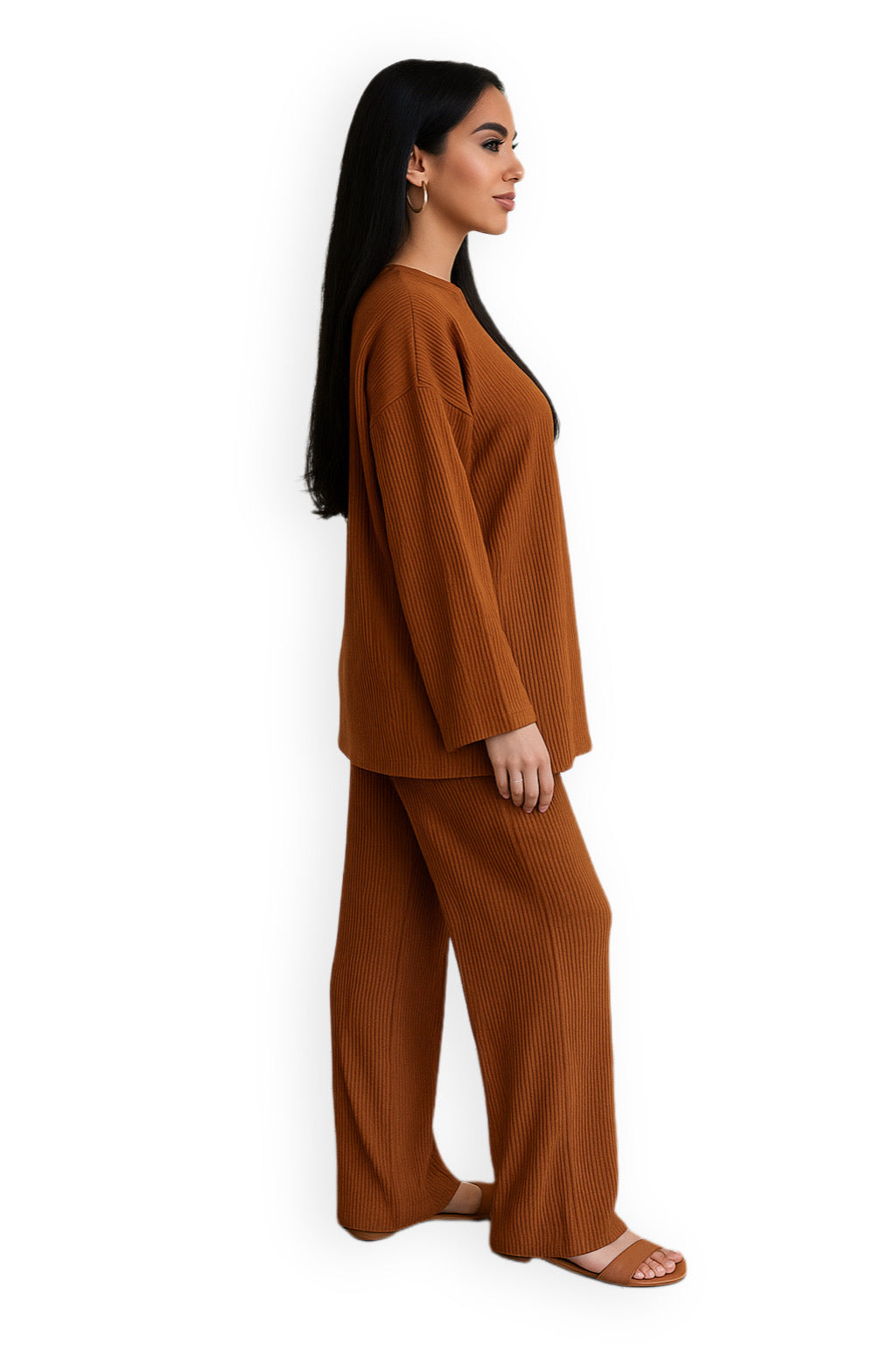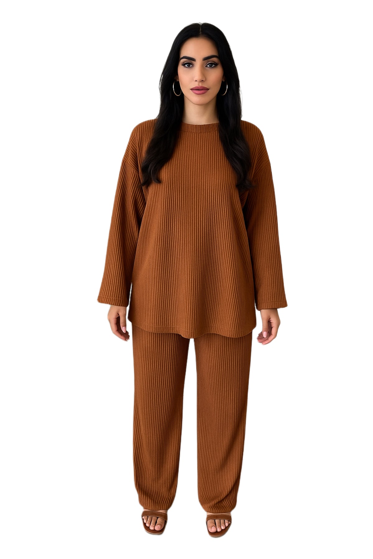 Understated elegance in earthy brown and clay gray knits. Oversized top and wide-leg trousers create a modern, fluid silhouette — perfect for cozy days with refined style.