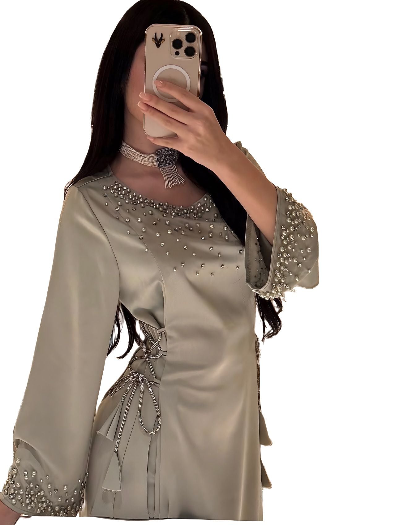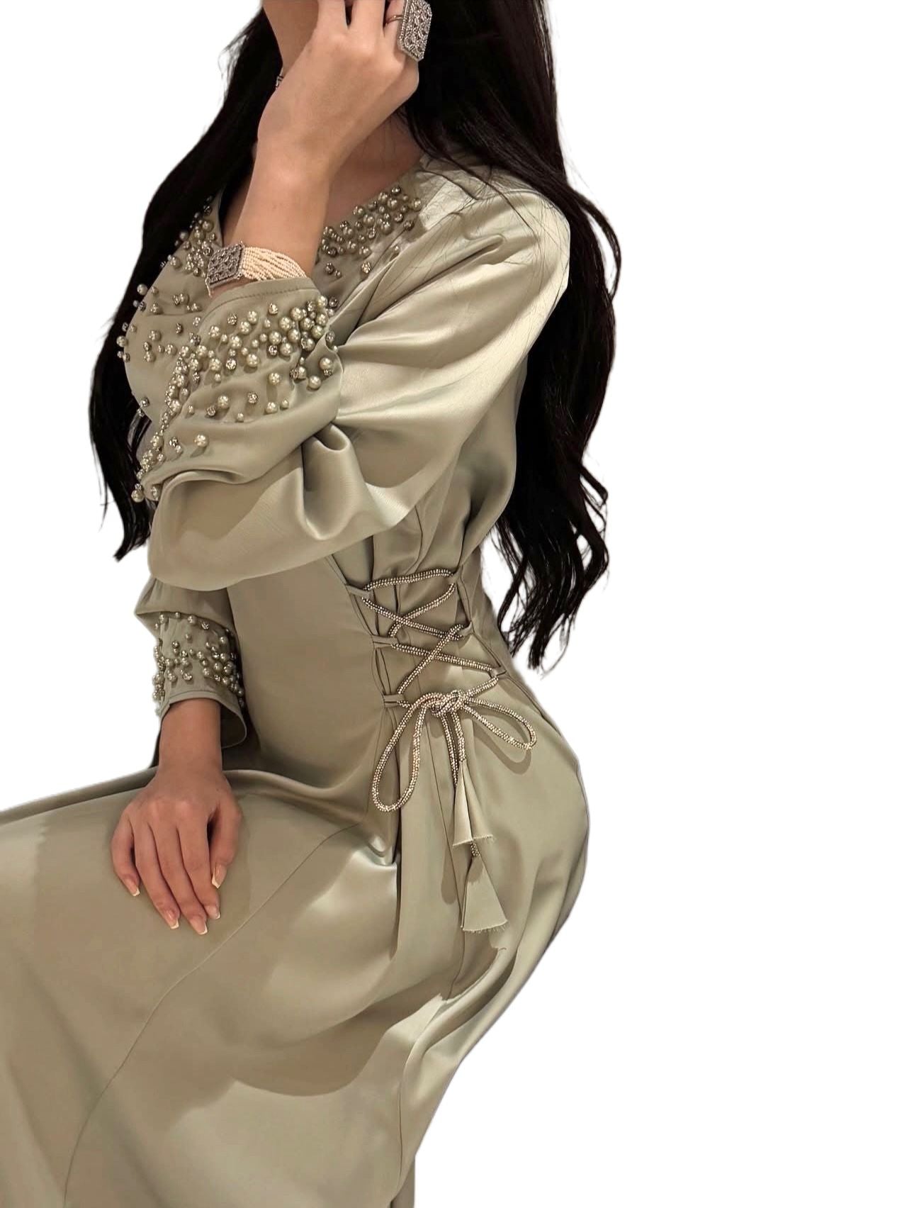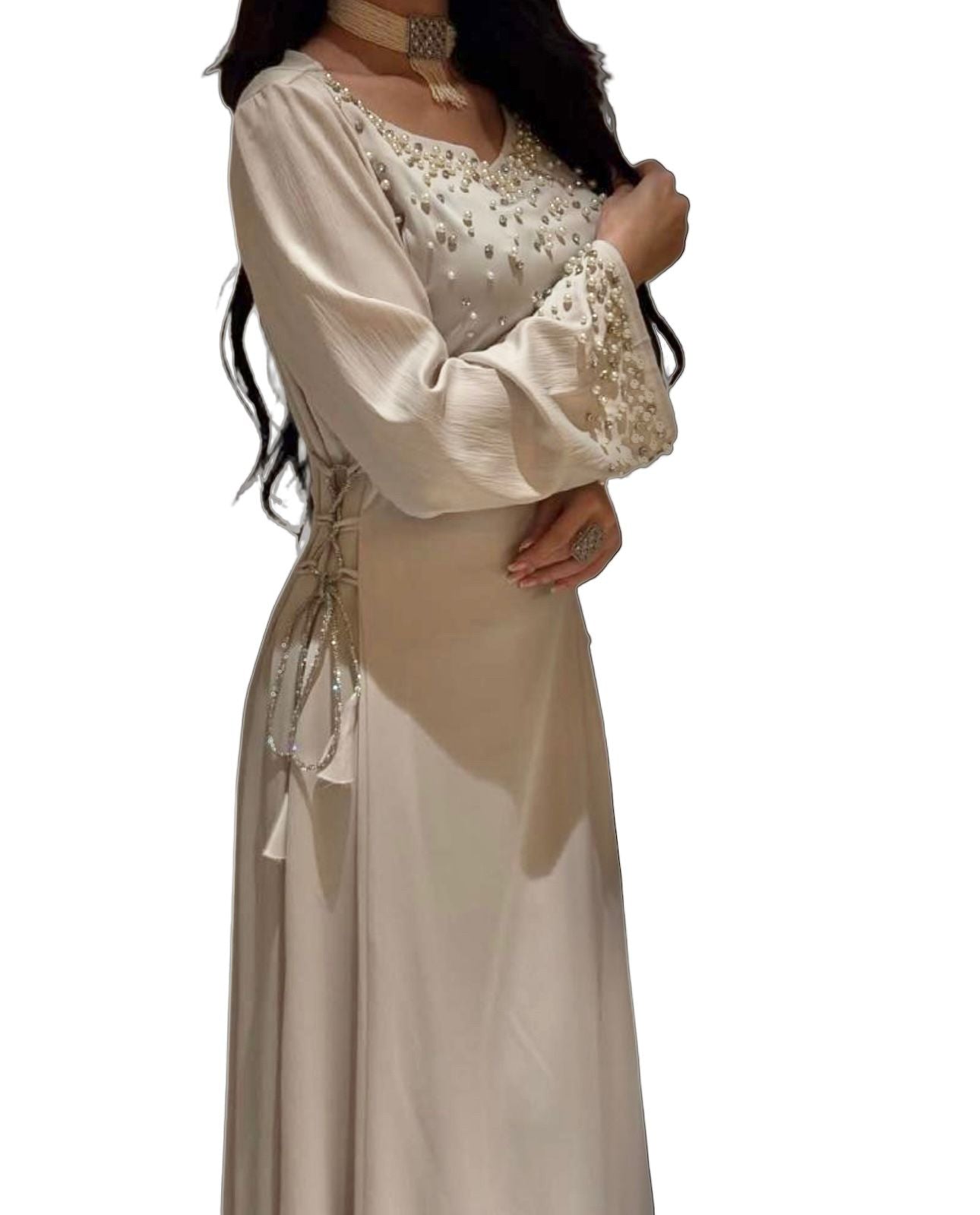 Timeless elegance redefined. The Amira Sea Pearls Dress features luxurious South Sea pearls along the neckline and a cinched waist for a flattering, feminine silhouette. Flowing and modest yet refined, this dress is perfect for weddings, parties, and special occasions where sophistication meets style.