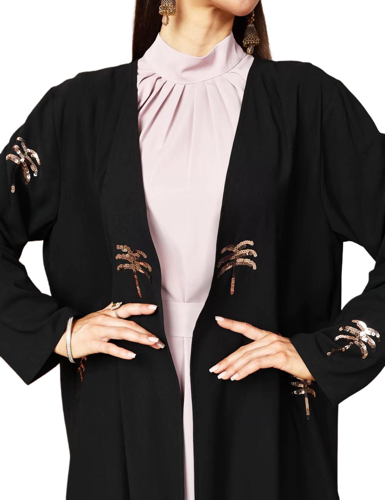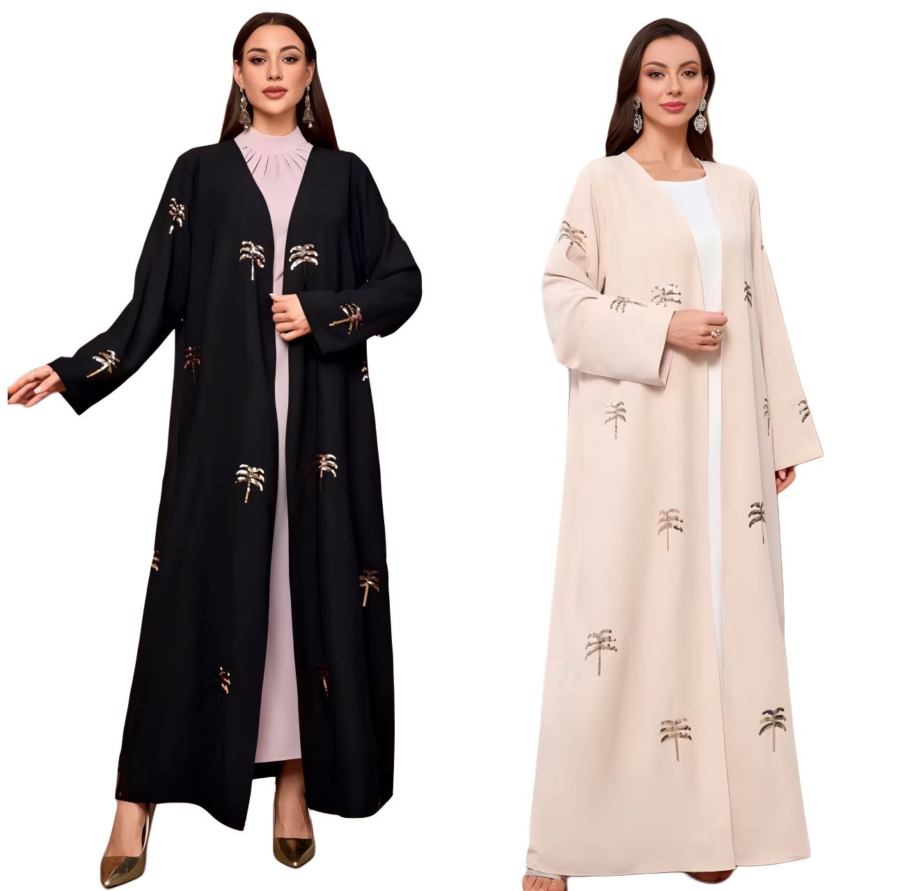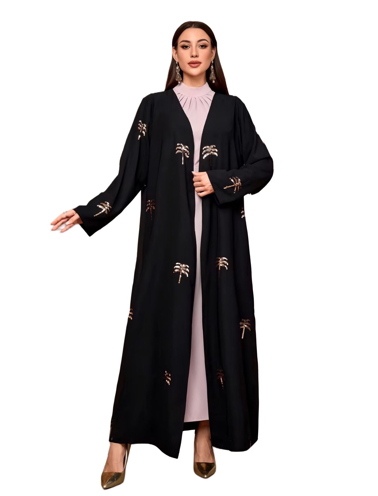 Sophisticated and luxurious, the Golden Palm Abaya features elegant golden details inspired by the graceful shape of a palm tree. Designed in a refined mix of black and beige, its flowing silhouette brings effortless elegance and timeless modesty. Perfect for special events, celebrations, or any occasion where you want to radiate confidence and sophistication.