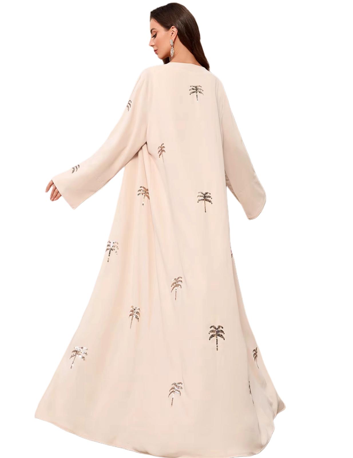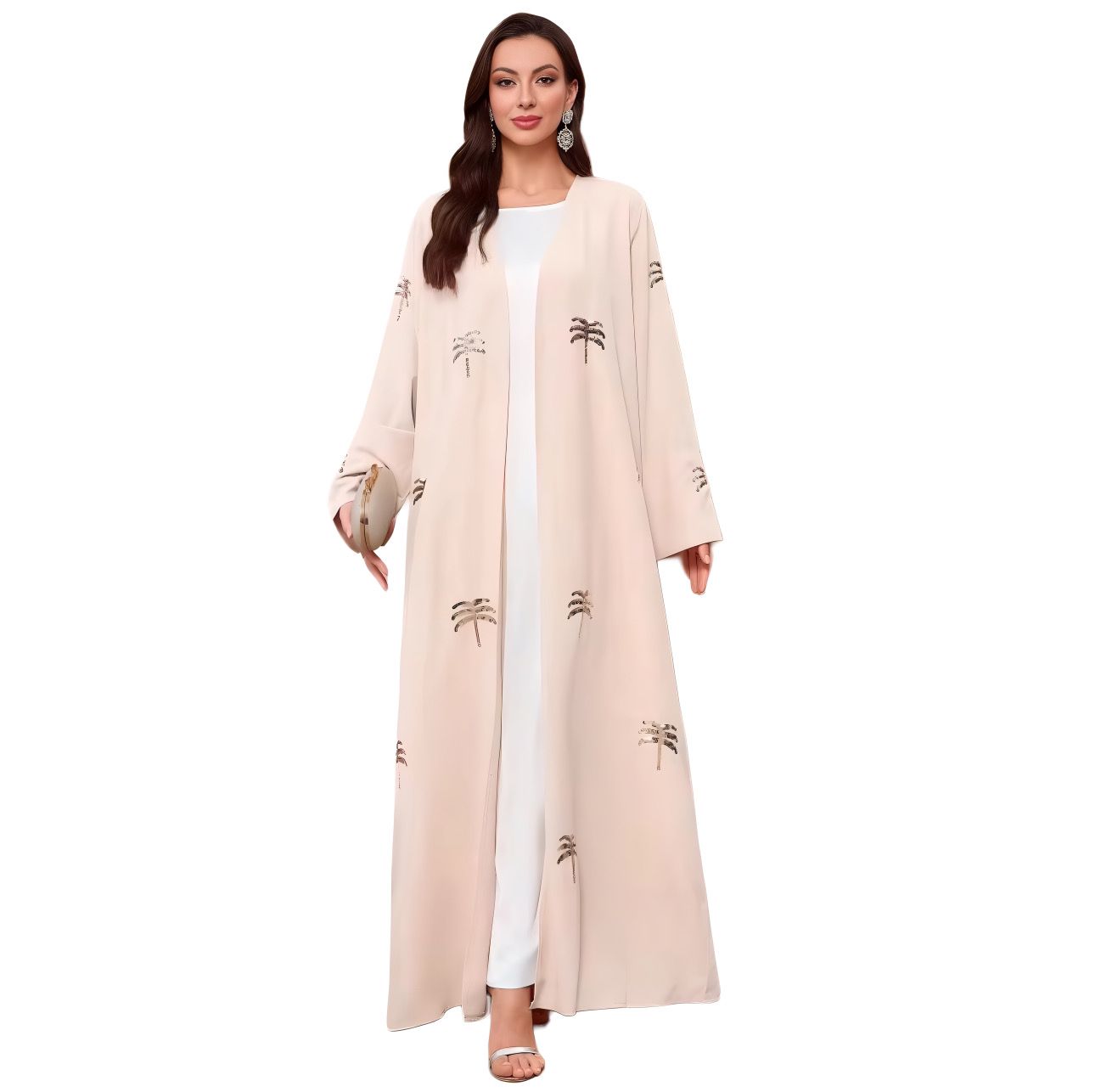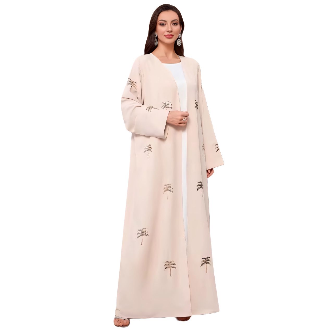 Sophisticated and luxurious, the Golden Palm Abaya features elegant golden details inspired by the graceful shape of a palm tree. Designed in a refined mix of black and beige, its flowing silhouette brings effortless elegance and timeless modesty. Perfect for special events, celebrations, or any occasion where you want to radiate confidence and sophistication.