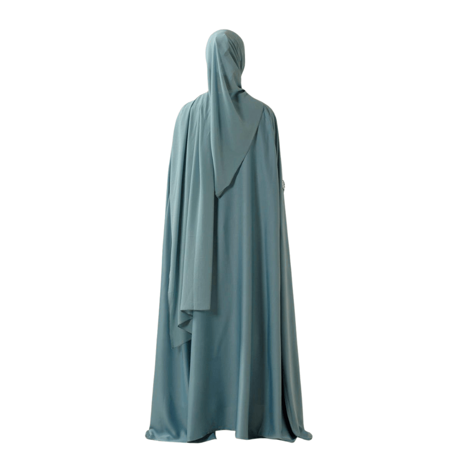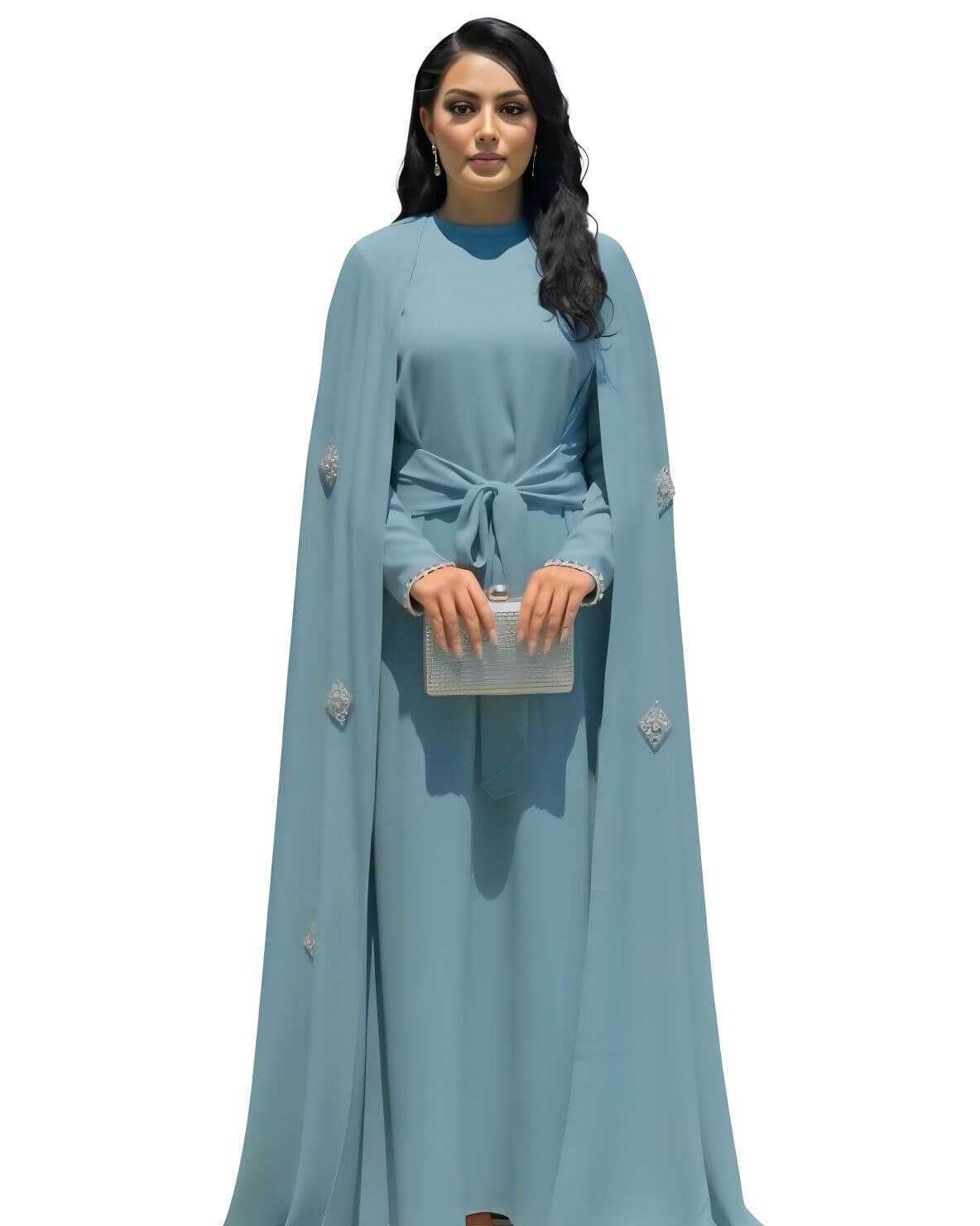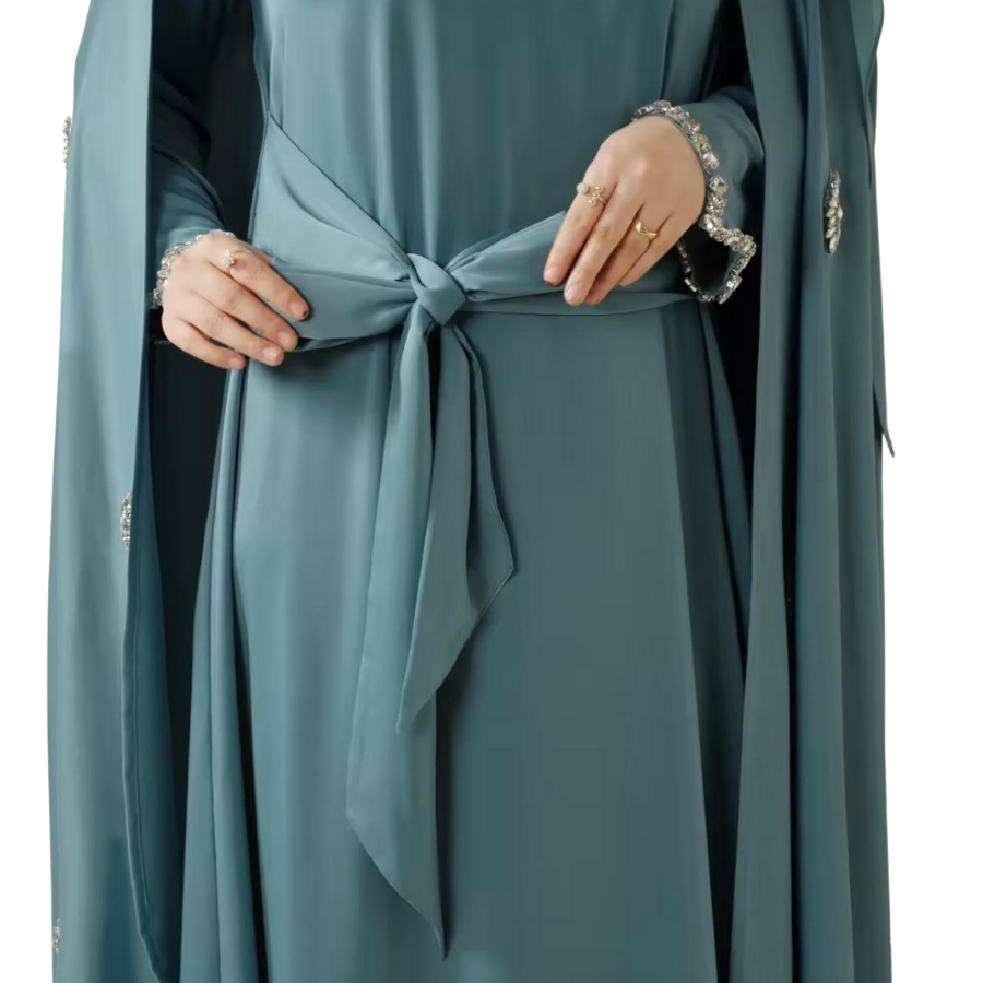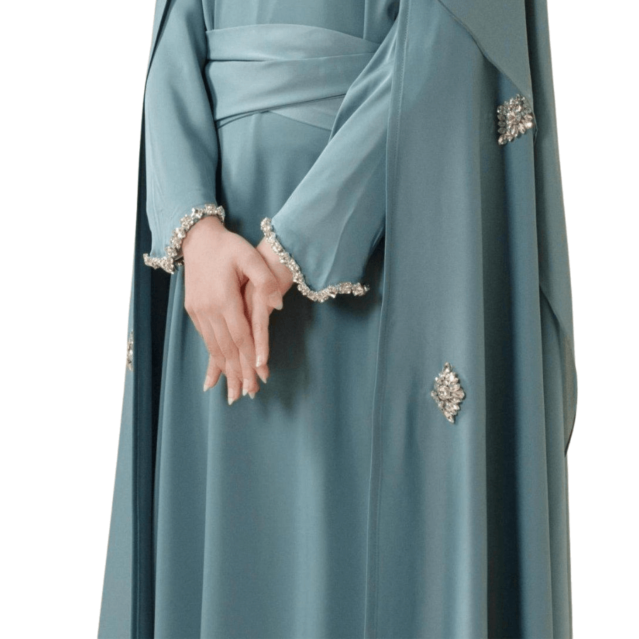 A luxury three-piece ensemble in luminous sapphire tones. Featuring a flowing abaya embellished with sparkling stones, a minimalist royal-blue dress with an integrated self-tie waist, and a matching hijab. Crafted from lightweight fabric for a graceful silhouette — the perfect choice for weddings, evening receptions, and festive gatherings.