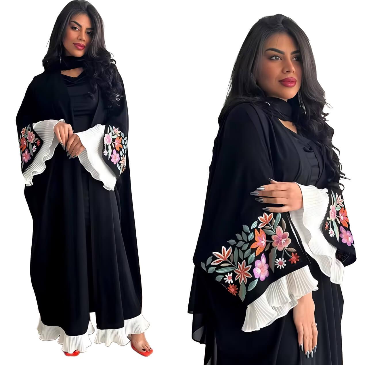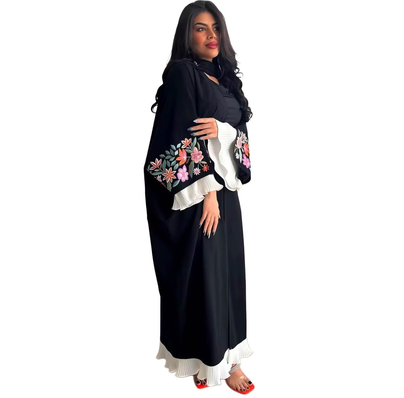 The Whispering Petals Abaya is an emblem of refined elegance and timeless sophistication. Crafted from sumptuous black fabric, its flowing sleeves are delicately embroidered with florals that cascade into soft white hems. Every detail exudes feminine allure and couture refinement — perfect for evening soirées, special celebrations, or prestigious gatherings.