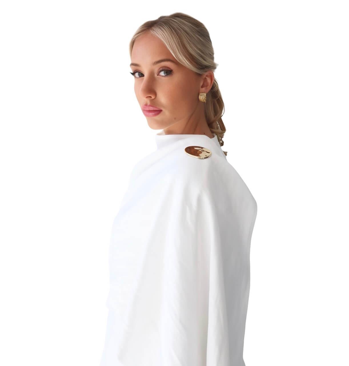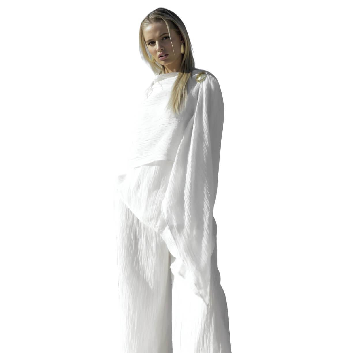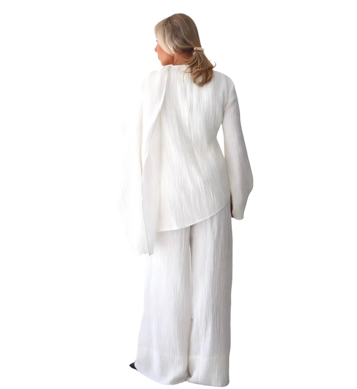 The Desert Dream co-ord in pristine white embodies effortless elegance and refined sophistication. The chic ensemble features a draped blouse with a subtle crossover design, accented by delicate gold-toned jewels on the shoulders for a touch of luxury. Paired with matching flowing bottoms, it exudes comfort, grace, and timeless style — perfect for special occasions, evening gatherings, or creating a statement look with understated opulence.